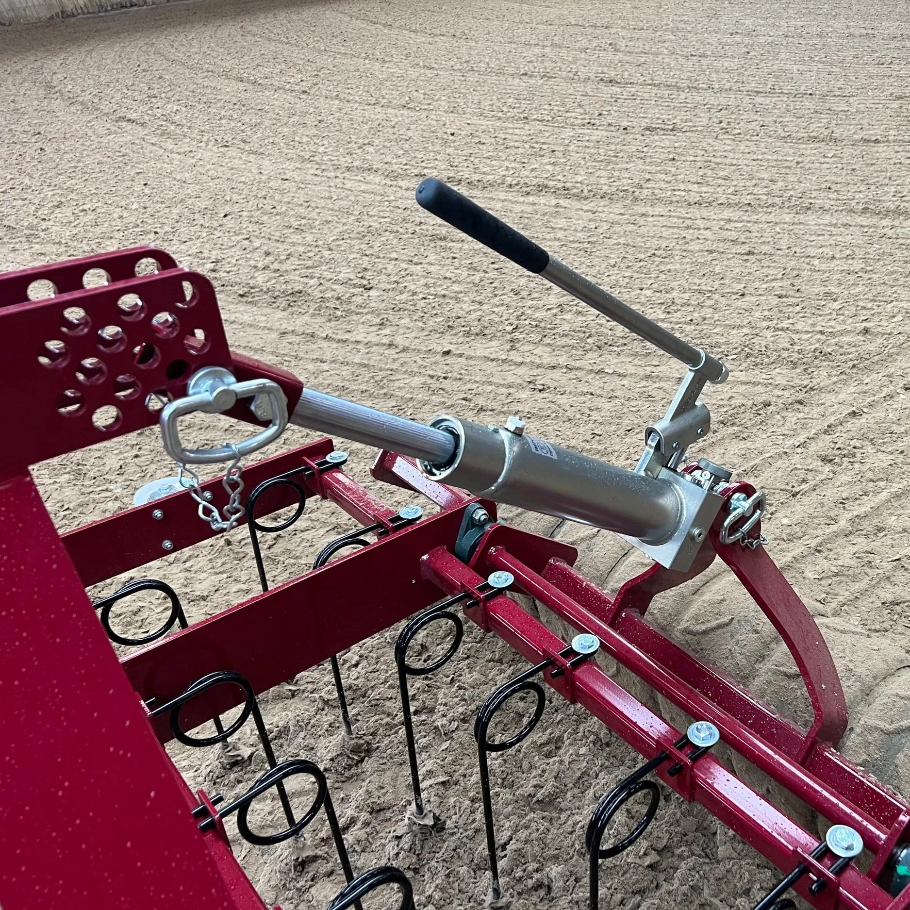 Pump få gange og ridebaneplaneren er i transportstilling. Drej en halv omgang på fingerskruen og den er i arbejdesstilling.